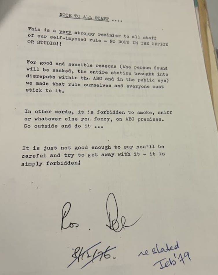 Clashes with ABC management have been inevitable. A memo distributed internally in 1976, and redistributed in 1979, gave “a very stroppy reminder to all staff of our self-imposed rule – NO DOPE IN THE OFFICE OR STUDIO!!”