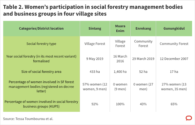 Table 2 highlights a disparity: while women actively engage in forest land use — such as collecting and processing non-timber forest products and cultivating social forestry land — in two sites (Enrekang and Muara Enim) they are not involved in management bodies where decisions about land use, forest resources and benefit distribution are made.