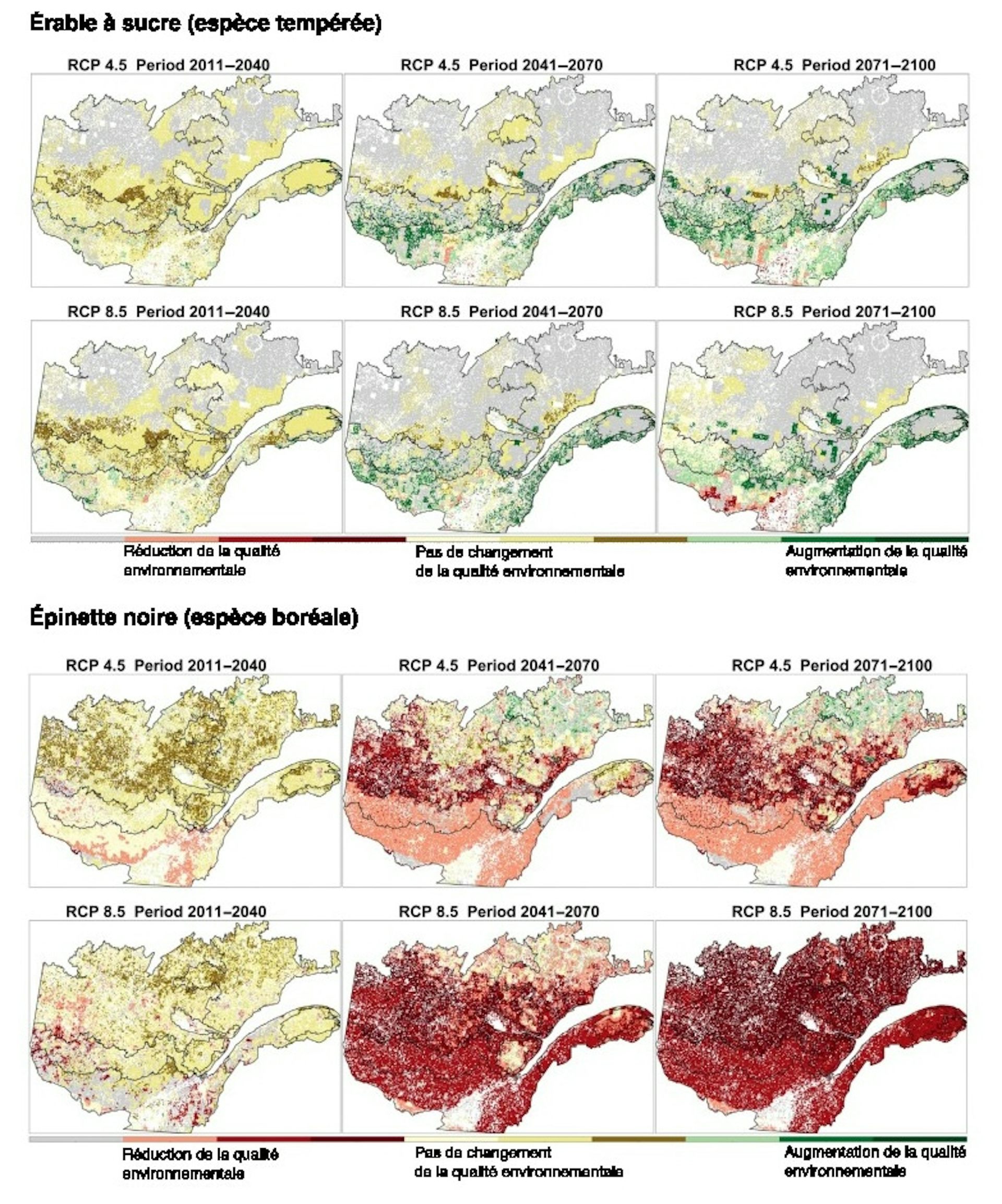 Today, a new reversal is on the horizon with human-induced global warming. Models predict that the current mixed boreal forest ecotone will almost entirely disappear from the landscape by 2100, giving way to a temperate forest dominated by sugar maples.