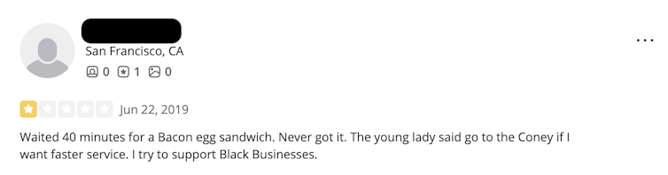 Yelp’s user base is predominantly white, educated and affluent. Making Detroit’s Black-owned restaurants more visible to Yelp users may have amplified cross-cultural interactions and frictions. For example, non-Black users sometimes mentioned “slower” and “rude” service as justifications for lower ratings. Close readings of these reviews hinted at intercultural and communicative clashes.